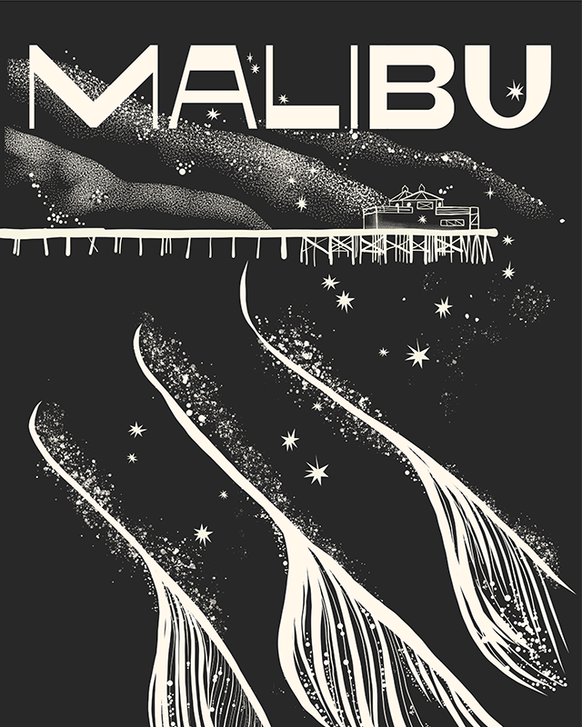 A bold, hand-drawn print capturing the energy of Malibu’s iconic surf, waves, and historic pier. With a graphic, modern style, this piece brings a fresh take on California’s most legendary surf spot. Printed on high-quality archival paper with rich, lasting color, it’s perfect for collectors, coastal decor, and surf-inspired spaces.